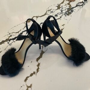 Beautiful elegant sandals. Model clarita. Material Satin and Rabbit fur, black. Heel Hight 4.25includes box and dust bag..very good condition.
