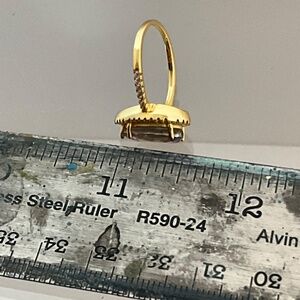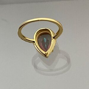 Beautiful gold plated ring with large Alexandrite pear shaped stone studded with crystals. I am not a big jewelry person, this ring looks expensive and is sure to get noticed. The stone is purple in bright light and changes to green in a dark room. The gold plating is on the top, sides and underneath the stone setting. The stone is large about 1/2” long.