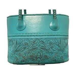Alexandro Yeo Mexican Leather Tooled Embossed Turquoise Tote Braided Handle
