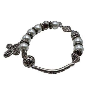 Alexa's Angels Bracelet Women Silver Tone Stretch Beaded Cross Religious 7.8"