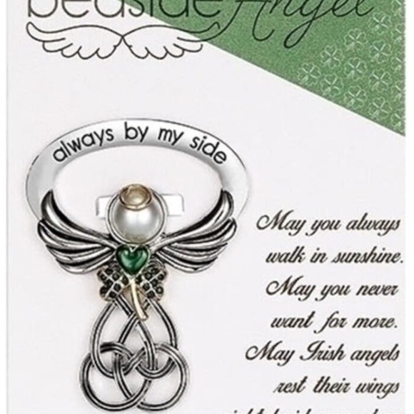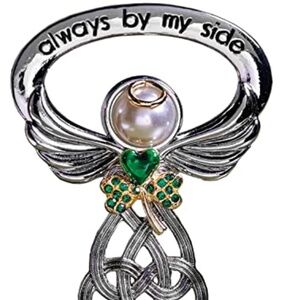 Reads : Always by my Side. Silver tone Angel holding gold tone shamrock ribbon with green crystal accent.