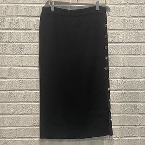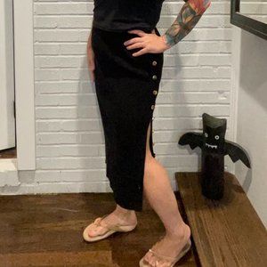 This midi length skirt has gold button details on the side. You can button or un-button depending on how long you want the side slit.