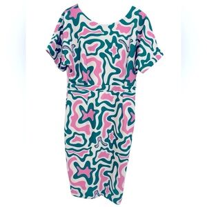 Stylish midi dress with abstract pattern. Features pink and green colors. Perfect for any occasion.