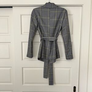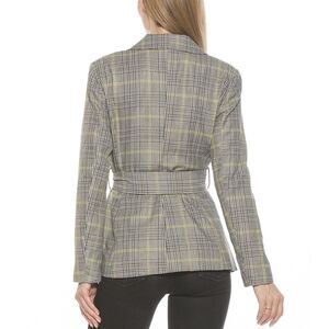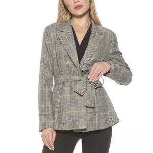 •Black, white, yellow Olya grey plaid blazer jacket, tie waist, hook eye clasp, collar