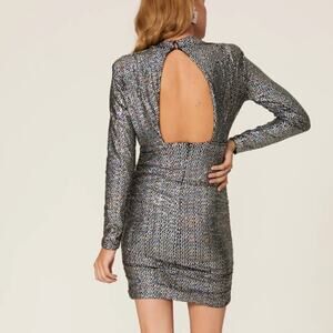 Flattering all over rainbow irridescent sequin with in this flattering bodycon mini dress with peekaboo back and long sleeves.