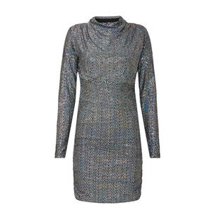 Flattering all over rainbow irridescent sequin with in this flattering bodycon mini dress with peekaboo back and long sleeves.