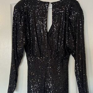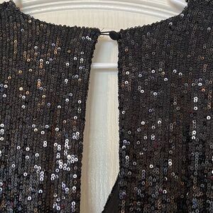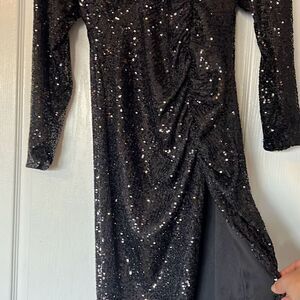 Covered with glittering sequins this flattering dress is adorned with a romantic thigh-high slit and a ruched detail