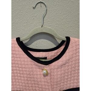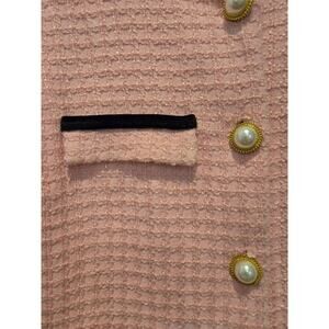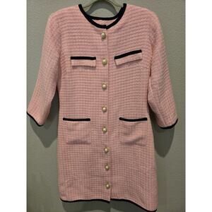 Keywords: Alexia Admor, sheath dress, pink tweed, formal dress, elegant, sophisticated, knee-length, 3/4 sleeve, round neck, pearl buttons, black trim, functional pockets, women's fashion, new condition.