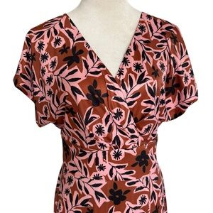 Chic floral maxi dress with V-neck. Features vibrant shades of brown. Perfect for any event. New without tags