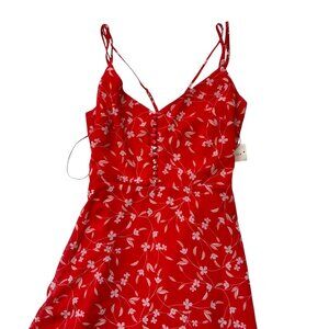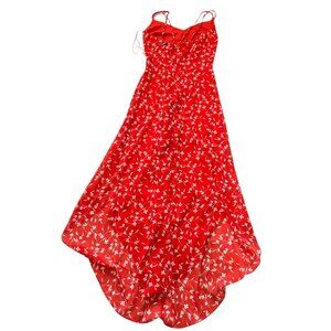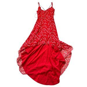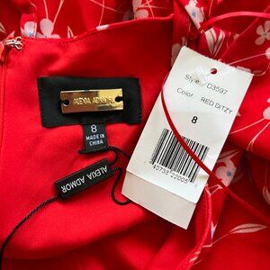 Alexia Admor Bailey dress in Red ditzy, red with white floral print, sleeveless, v neck, button details, criss cross straps, high low flounce hem, size 8, pit to pit: 18", waist flat: 13", length: 36-62", new with tags