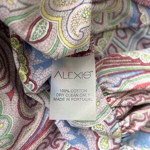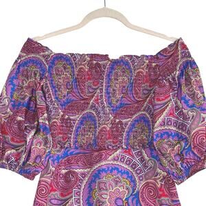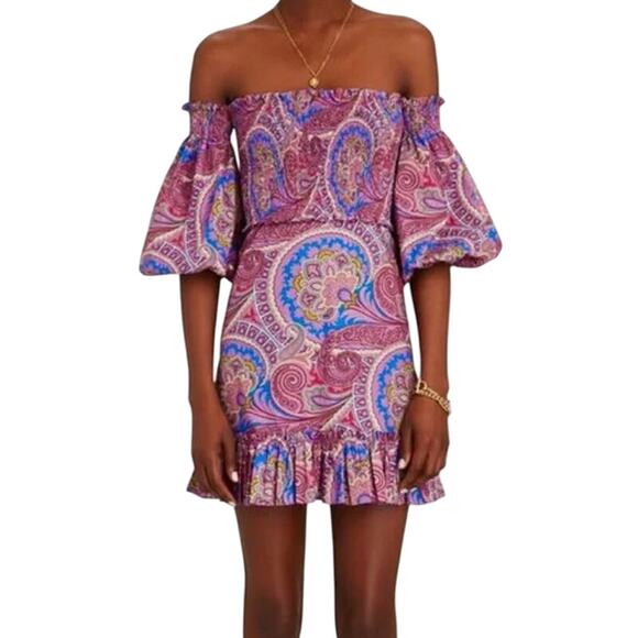 Alexis Alona Off the Shoulder Paisley Mini Dress Smocked Puff Sleeve Purple