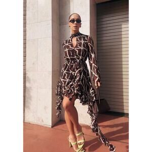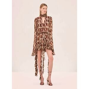 The Amalia Dress is a long sleeve mini silhouette featuring a tie waist, ruffle detailing, and an abstract print.