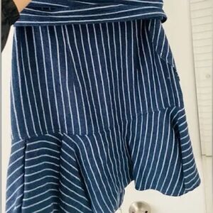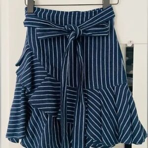 Alexis Anvivi blue/white striped wrap mini skirt. Features self tie at waist, front diagonal ruffle and flounced hem.