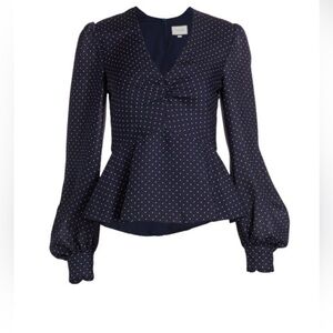 Stylish navy blouse by Alexis featuring white polka dots. Perfect for any occasion. Balloon sleeve, cinched at bust, slight a-line in the body below bust. Excellent like new condition. This brand runs small please see measurements in the photos.