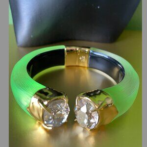 This hand-sculpted Lucite hinged bracelet is hand-painted in a luminous neon green hue and finished with dazzling oversized custom-cut bonbon crystals set in molten 14k gold plated metal end caps. Giving an 80's sporty meets glam vibe