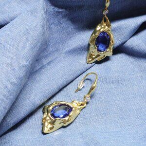 Elegant Alexis Bittar drop earrings featuring deep blue sodalite accented with shimmering quartz doublets. Part of the brand’s “Brut” style collection, these earrings showcase a raw, organic texture with a modern gold-tone finish. Lightweight yet eye-catching, perfect for adding a bold touch to any outfit.