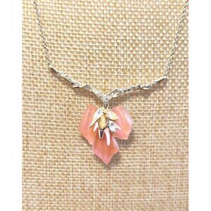 From the Desert Jasmine collection, this necklace features a hand carved and hand painted Lucite orchid with custom cut clear crystal and picture jasper center dangling from a branch of pave gold tone metalwork.