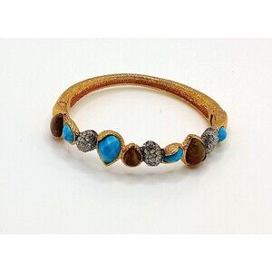 The smooth vibrancy of rose-cut turquoise is set in contrast to cabochons of earthy, iridescent labradorite and sections of shimmering crystal pavé, across a richly gilt bracelet. Turquoise and labradorite;Swarovski crystal Silvertone and goldtone