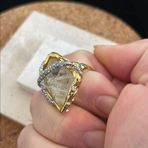 This exquisite Alexis Bittar ring showcases a stunning blend of gold and silver tones, featuring a large crystal centerpiece. The asymmetrical design is enhanced by a silver-toned ribbon accent, adding a touch of elegance and sophistication to this standout piece.
