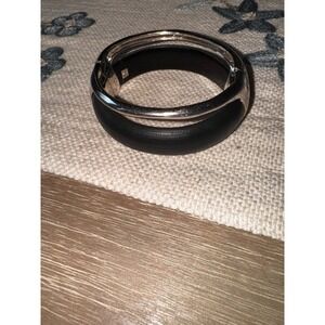 Keywords: Alexis Bittar, bangle bracelet, hinged bracelet, black lucite, silver tone, modern jewelry, designer bracelet, statement jewelry, women's bracelet, fashion accessory, elegant bracelet, minimalist bracelet