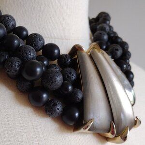 Make a statement with this beautifully handmade necklace by Alexis Bittar! Designed with 5 strands of tektite beads 1/4-3/8" in diameter. The clasp at the center of the necklace has 2 hand carved pieces of Lucite and metal on one side. It has a fold under magnetic closure with an Alexis Bittar maker's mark on the backside. Alexis Bittar has received numerous industry awards for his jewelry design and his pieces have been worn by many celebrities including Beyonce, Khloe Kardashian, Bella Hadid, Kylie Jenner and Angelina Jolie.