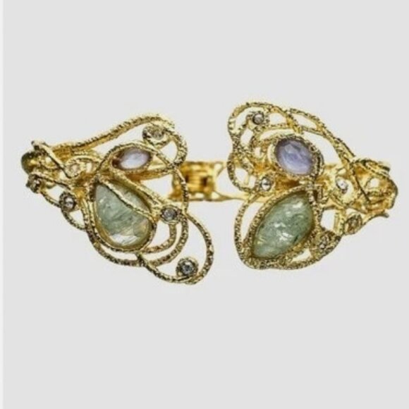 Gorgeous semiprecious gemstones, moss agate and possibly mother of pearl, with Swarovski crystal rhinestones adorn this organic, lacy filigree cuff, gold plated. Hinged closure.