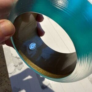 Alexis Bittar Hand-Carved Lucite Bangle – Teal & Gold. Striking hand-crafted bangle by Alexis Bittar, featuring a translucent teal Lucite exterior with a textured finish and a smooth metallic gold interior. This statement piece is lightweight yet bold, perfect for stacking or wearing solo. The bracelet is hand-carved and made in the USA, showcasing Alexis Bittar’s signature artistry and attention to detail.