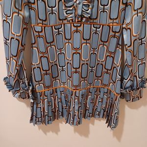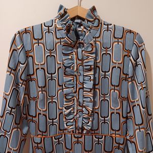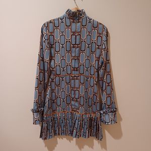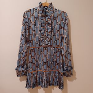 Stylish Alexis dress with a blue and white geometric pattern. Features long sleeves and a short hemline. Perfect for a chic look.