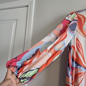 Vibrant long sleeve dress with abstract patterns. Features a mix of pink, orange, green, and blue colors.