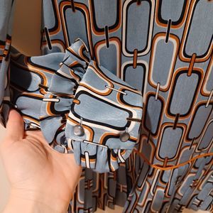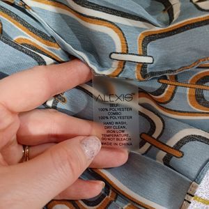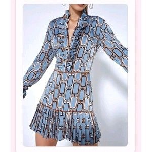 Alexis Cosi Mini Retro Pleated Long Sleeve Dress in Blue Slate Link Print Size S