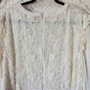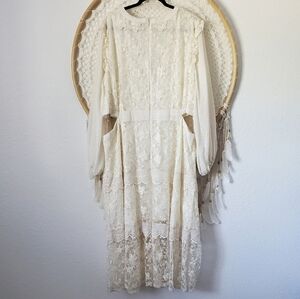 Alexis x Target Cream Lace Cutout Long Sleeved Designer Collection Dress. New with Tags. Showcases an all over baroque lace construction for an elegant romantic look complete with fluttery lace trim gracing the v neck line and frilly panels of scallop lace on the layered bottom tier. Puff sleeves add to the statement look Lace up neckline with tassels tie Side cutouts.