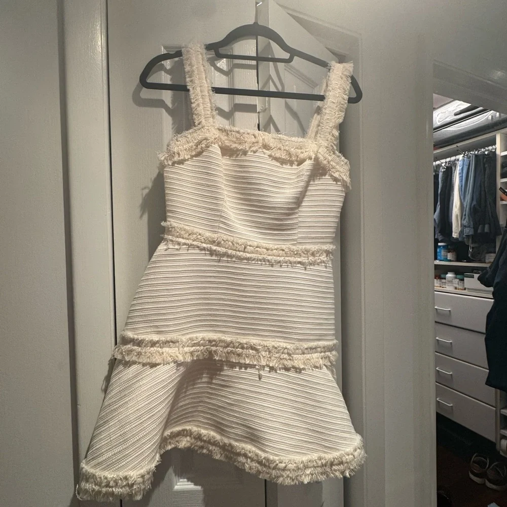 This stunning Alexis sundress in cream is perfect for a wedding guest or cocktail event. Featuring a ribbed texture and ruffled hem, the sleeveless design with a square neckline offers a flattering silhouette. The mini length and structured shape add a playful yet elegant touch to your ensemble.