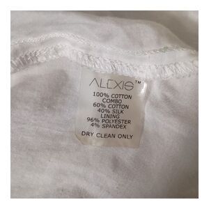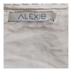 The Alexis Dress is a stylish and elegant white dress made from 100% cotton crochet fabric, featuring a V-neckline and bell sleeves. Perfect for travel, parties, or casual outings, this short length dress has a floral pattern and is adorned with woven accents. Designed by the ALEXIS brand, this bohemian designer piece is a stunning choice for the summer and spring seasons. The dress is lined for added comfort and has a pullover closure, making it a convenient and fashionable choice for any woman looking to make a statement with their outfit. Pit to Pit: 18", Length: 31"