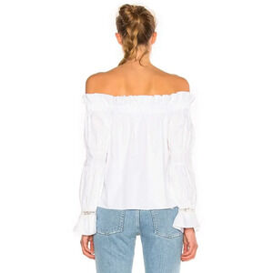 Alexis Ellen Off-The-Shoulder Top in White. Size L / Large. Features elastic off-the-shoulder neckline, long sleeves with banded elbows and lace trim, and loose fit. 100% Cotton. Excellent pre-owned condition, no flaws.