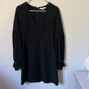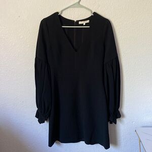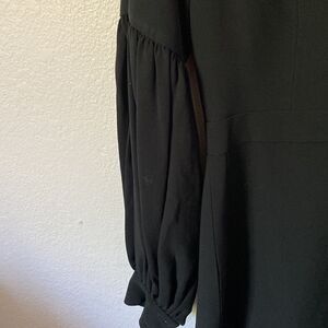 Plunging neckline. Gathered sleeves. A-line silhouette. Hidden back zip. Mini length. Button Closure Sleeves.
