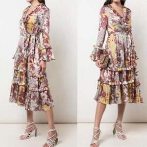 Alexis Floral Wiera Printed Wrap Dress in Berry Pink Paisley. Size Large. ***PLEASE READ*** This was professionally converted from a wrap dress into a regular dress and therefore doesn't have the belt. Stitching can probably be undone, but not sure. Still has a piece from wrap. Please see video. Makes this dress super unique 🤩. Punchy paisley adorns this tier cuff dress while a plunging V-neck adds a sultry feel. Features a deep V-neck, long sleeves, tiered bell cuffs, a tiered ruffle hem, and a a fun vibrant floral paisley print. Dress is unlined.Retails for: $758.