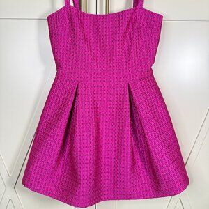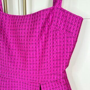 Vibrant fuchsia mini dress. Square neckline. Sleeveless design. Flared skirt.