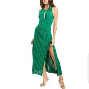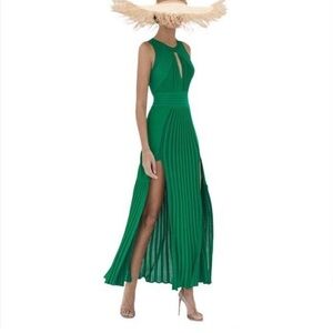 55% viscose, 30% polyamide, 10% poly, 5% metallic. Dry clean only. Unlined. Open back with decorative pearl button closure. Lurex knit fabric with pleated panels. Open knit trim