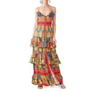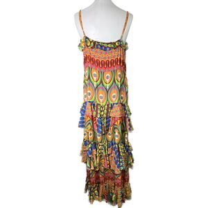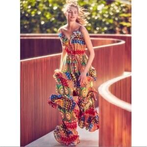 Keywords: Pre-owned, fabric pulls, Alexis, Harmonie Maxi Dress, Multicolor, Size M, MSRP $880, printed, crepe, maxi, sleeveless, V-neckline, front button down placket, partially lined, flowing tiers of ruffles, mesmerizing movement.