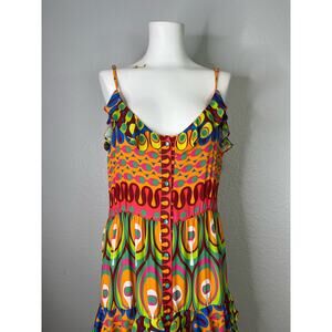 Make a statement with this pre-owned Alexis Harmonie Maxi Dress in a vibrant multicolor print. The dress is made of printed crepe fabric, consisting of 100% polyester, which offers a lightweight and flowing feel. The maxi length adds an elegant and sophisticated touch, while the sleeveless design keeps you cool and comfortable. The dress features a V-neckline and an exposed front button-down placket. However, please note that there are fabric pulls on the front buttons and around the button areas, as shown in the last 2 pictures. Despite this flaw, the dress remains stunning and bold, with flowing tiers of ruffles adding mesmerizing movement to the hemline. It is partially lined for added coverage. Imported for the finest quality.