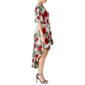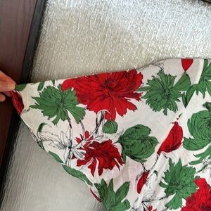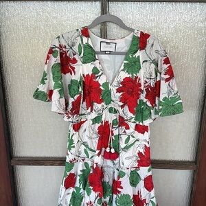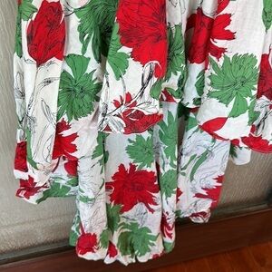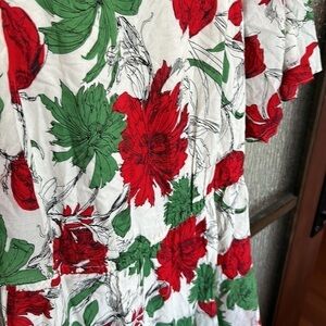 White floral printed cotton (100% Cotton). Empire. Short sleeves. V-neckline. Partially lined. 33" from shoulder to shortest hemline. Imported.