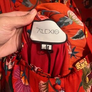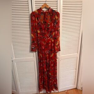 This elegant Alexis jumpsuit features a striking reds/oranges with blue/green color palette, perfect for a wedding guest or cocktail event. The long bishop sleeves and cowl neck add a touch of sophistication, while the flowing silhouette ensures a graceful appearance. Crafted with a lavallière style, it offers both comfort and chic appeal for any night out.