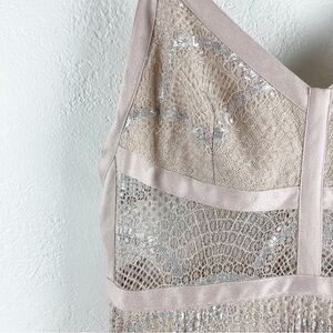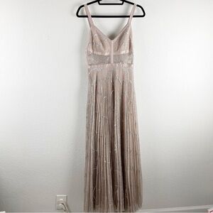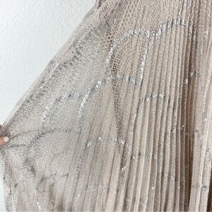 Pleated sheer metallic mesh overlay, satin trim finishes, back zip closure, Sleeveless, sweetheart neckline, a-line skirt, semi sheer waist. Blush pink silver. Nylon blend. Dry clean only.