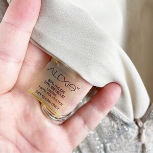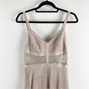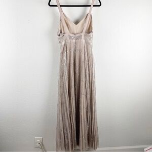 Pleated sheer metallic mesh overlay, satin trim finishes, back zip closure, Sleeveless, sweetheart neckline, a-line skirt, semi sheer waist. Blush pink silver. Nylon blend. Dry clean only.