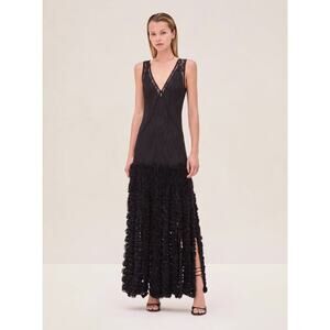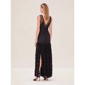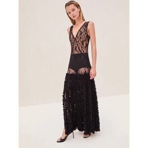 The Jeysa Dress is a lace gown with an embroidered and fringe hem detail and includes a removable slip for added coverage.
