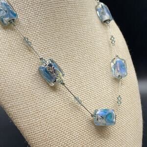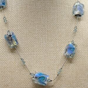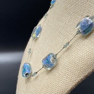 Alexis K Blue Dichroic Glass Necklace Beaded Sliver Tone