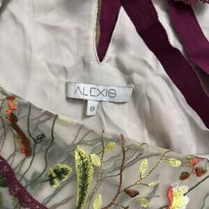 This Alexis Kylie blouse is a true statement piece, featuring intricate multicolor floral embroidery on sheer ivory mesh. Designed with cold shoulder cutouts, ruffled sleeve cuffs, and a burgundy ribbon tie at the back. Fully lined through the body with sheer long sleeves for a romantic, elevated look. Perfect for special occasions, date nights, or chic daytime style.