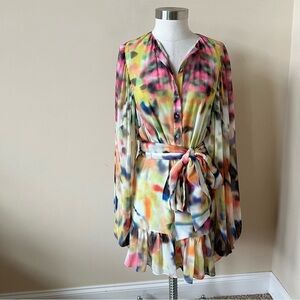 Crafted of crepe, Alexis' Leonie minidress flaunts a vibrant abstract print, long blouson sleeves, and a self-tie belt at the waist.