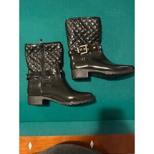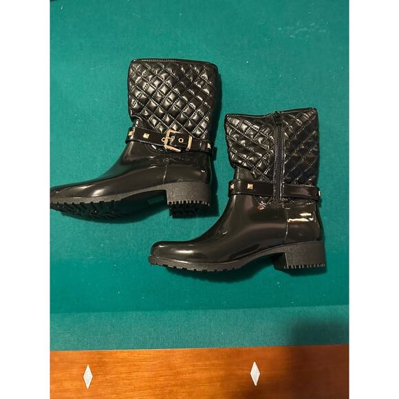 Alexis Leroy Black Quilted Rain Boots Women’s 39 US 8 Stud Buckle Mid-Calf