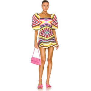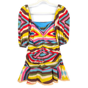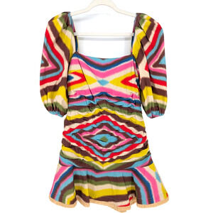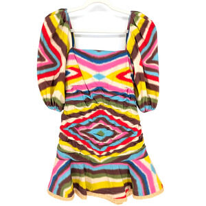 Alexis Montaigne Maui Raffia Trim Multicolor Puff Sleeve Mini Dress Maximalist M